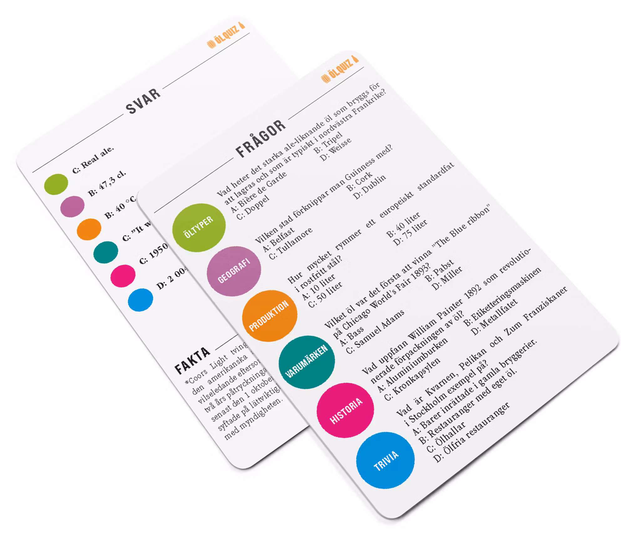 I Ölquiz presenteras den rika ölkulturen i kluriga, roliga och lärorika frågor. Här blandas skratt och gissningar med kuriosa och kunskap om allt från ölstilar och bryggtekniker till historia, geografi och ölkultur världen över. Spelet passar lika bra för nyfikna nybörjare som för inbitna öldrickare.
